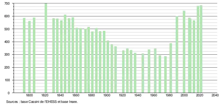 L'évolution du nombre d'habitants est connue à travers les recensements de la population effectués dans la commune depuis 1793. Pour les communes de moins de 10 000 habitants, une enquête de recensement portant sur toute la population est réalisée tous les cinq ans, les populations légales des années intermédiaires étant quant à elles estimées par interpolation ou extrapolation[16]. Pour la commune, le premier recensement exhaustif entrant dans le cadre du nouveau dispositif a été réalisé en 2007[17].
