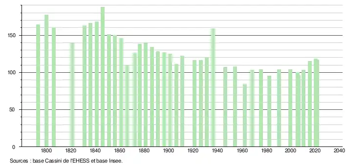 L'évolution du nombre d'habitants est connue à travers les recensements de la population effectués dans la commune depuis 1793. Pour les communes de moins de 10 000 habitants, une enquête de recensement portant sur toute la population est réalisée tous les cinq ans, les populations légales des années intermédiaires étant quant à elles estimées par interpolation ou extrapolation[24]. Pour la commune, le premier recensement exhaustif entrant dans le cadre du nouveau dispositif a été réalisé en 2005[25].