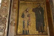 Roger II de Sicile, détail de la mosaïque « Roger couronné roi par le Christ », église de la Martorana, Palerme. | |