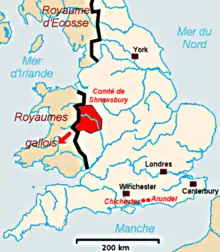 En , Roger II de Montgommery accompagna outre-Manche son duc, devenu roi d'Angleterre. Il reçut d'abord le rape d'Arundel (comprenant la ville de Chichester), deux lieux essentiels à la défense du sud de l'Angleterre. Ce secteur se révéla particulièrement calme. Guillaume le Conquérant confia alors à son fidèle compagnon une région plus troublée : le Shropshire (dont la ville principale est Shrewsbury), en , avec des pouvoirs palatins. Quelques historiens pensent que son élévation au rang de comte date de fin 1074[11]. Aux côtés d'Hugues d'Avranches, comte de Chester et de Roger de Breteuil, comte de Hereford, le nouveau comte devait protéger le royaume contre les incursions galloises. En conséquence, plusieurs châteaux furent élevés dont celui de Montgomery, à la limite du comté. En 1093, l'année avant sa mort, Roger de Montgommery s'empara de Ceredigion et Dyfed, le cœur du royaume gallois de Deheubarth[12].