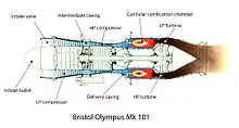 - Postcombustion : Dès 1952, Bristols avait envisagé l'utilisation de la réchauffe ou post-combustion, pour augmenter la poussée de l'Olympus. Au départ, un système appelé Bristol Simplifed Reheat a été conçu et a été testé sur un Rolls-Royce Derwent V monté dans un Avro Lincoln.