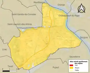 La commune fait partie du territoire à risques importants d'inondation (TRI) d'Avignon – plaine du Tricastin – Basse vallée de la Durance, regroupant 90 communes du bassin de vie d'Avignon, Orange et de la basse vallée de la Durance, un des 31 TRI qui ont été arrêtés fin 2012 sur le bassin Rhône-Méditerranée[18]. Il a été retenu au regard des risques de débordements du Rhône, de la Durance, de la Cèze, du Lez (84), de l'Ardèche, de l'Eygues, du Rieu (Foyro), de la Meyne, de l'Ouvèze, des Sorgues, des rivières du Sud-Ouest du mont Ventoux, de la Nesque, du Calavon et de l'Èze. Les crues récentes significatives sont celles d'octobre 1993 (Rhône-Lez), de janvier et novembre 1994 (Rhône, Durance, Calavon, Ouvèze), de décembre 1997, de novembre 2000, de mai 2008 (Durance), de décembre 2003 (Rhône, Calavon), de septembre 1992 (Ouvèze), de septembre 2002 et de 2003 (Aygue, Rieu Foyro), de septembre 1958, de septembre 1992 (Ardèche), de septembre 1993 (Èze). Des cartes des surfaces inondables ont été établies pour trois scénarios : fréquent (crue de temps de retour de 10 ans à 30 ans), moyen (temps de retour de 100 ans à 300 ans) et extrême (temps de retour de l'ordre de 1 000 ans, qui met en défaut tout système de protection)[19],[20]. La commune a été reconnue en état de catastrophe naturelle au titre des dommages causés par les inondations et coulées de boue survenues en 1982, 1987, 1991, 2002, 2003, 2004 et 2008[21],[16].