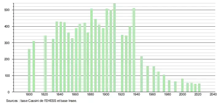 L'évolution du nombre d'habitants est connue à travers les recensements de la population effectués dans la commune depuis 1800. Pour les communes de moins de 10 000 habitants, une enquête de recensement portant sur toute la population est réalisée tous les cinq ans, les populations légales des années intermédiaires étant quant à elles estimées par interpolation ou extrapolation[7]. Pour la commune, le premier recensement exhaustif entrant dans le cadre du nouveau dispositif a été réalisé en 2006[8].