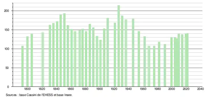 L'évolution du nombre d'habitants est connue à travers les recensements de la population effectués dans la commune depuis 1793. Pour les communes de moins de 10 000 habitants, une enquête de recensement portant sur toute la population est réalisée tous les cinq ans, les populations légales des années intermédiaires étant quant à elles estimées par interpolation ou extrapolation[17]. Pour la commune, le premier recensement exhaustif entrant dans le cadre du nouveau dispositif a été réalisé en 2004[18].