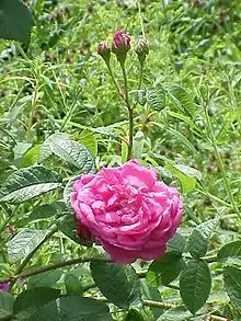 - 'Rose de Rescht', aux fleurs rose fuchsia. Variété découverte en 1940 près de Rescht (Rascht) en Iran par Miss Nancy Lindsay qui l'introduisit en Europe. D'autres sources indiquent que cette rose pourrait être en fait d'origine française, apparue vers 1800 ; puis elle aurait été exportée en Perse en 1807 pour revenir en France vers 1840[3].