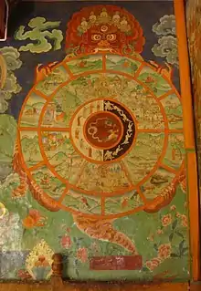D'origine indienne, la roue de la vie est fréquente dans le monde tibétain. Elle constitue un outil d'enseignement important.