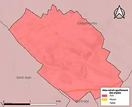 Le retrait-gonflement des sols argileux est susceptible d'engendrer des dommages importants aux bâtiments en cas d’alternance de périodes de sécheresse et de pluie. La totalité de la commune est en aléa moyen ou fort (88,8 % au niveau départemental et 48,5 % au niveau national). Sur les 700 bâtiments dénombrés sur la commune en 2019, 700 sont en aléa moyen ou fort, soit 100 %, à comparer aux 98 % au niveau départemental et 54 % au niveau national. Une cartographie de l'exposition du territoire national au retrait gonflement des sols argileux est disponible sur le site du BRGM[22],[Carte 3].