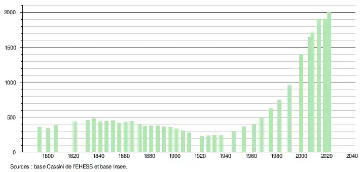 | L'évolution du nombre d'habitants est connue à travers les recensements de la population effectués dans la commune depuis 1793. Pour les communes de moins de 10 000 habitants, une enquête de recensement portant sur toute la population est réalisée tous les cinq ans, les populations légales des années intermédiaires étant quant à elles estimées par interpolation ou extrapolation[31]. Pour la commune, le premier recensement exhaustif entrant dans le cadre du nouveau dispositif a été réalisé en 2008[32]. En 2021, la commune comptait 2 008 habitants[Note 6], en diminution de 0,25 % par rapport à 2015 (Haute-Garonne : +7,43 %, France hors Mayotte : +1,84 %). |