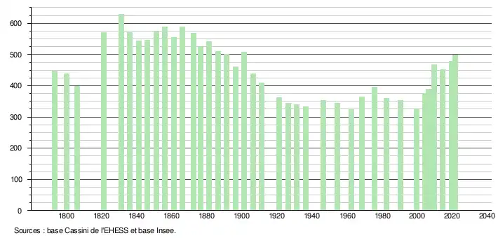L'évolution du nombre d'habitants est connue à travers les recensements de la population effectués dans la commune depuis 1793. Pour les communes de moins de 10 000 habitants, une enquête de recensement portant sur toute la population est réalisée tous les cinq ans, les populations légales des années intermédiaires étant quant à elles estimées par interpolation ou extrapolation[17]. Pour la commune, le premier recensement exhaustif entrant dans le cadre du nouveau dispositif a été réalisé en 2004[18].