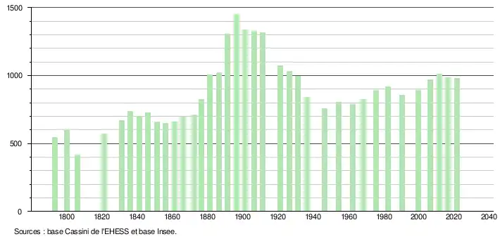 L'évolution du nombre d'habitants est connue à travers les recensements de la population effectués dans la commune depuis 1793. Pour les communes de moins de 10 000 habitants, une enquête de recensement portant sur toute la population est réalisée tous les cinq ans, les populations légales des années intermédiaires étant quant à elles estimées par interpolation ou extrapolation[23]. Pour la commune, le premier recensement exhaustif entrant dans le cadre du nouveau dispositif a été réalisé en 2006[24].