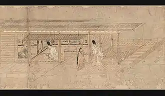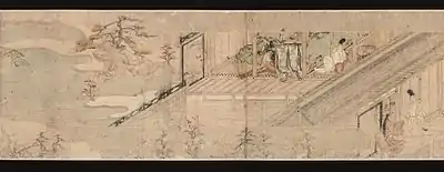 Les illustrations de romans, contes ou journaux sont appréciées par les dames de la cour dès l’époque de Heian, dont il reste des emaki fameux comme les Rouleaux illustrés du Dit du Genji ou le Roman enluminé de Nezame. Durant l’époque de Kamakura (1185-1333), l’intérêt pour la culture raffinée des aristocrates de l’époque de Heian perdure avec la production d’emaki sur la vie à la cour comme les Rouleaux enluminés du journal intime de Murasaki Shikibu, les Contes enluminés d’Ise, le Rouleau enluminé des Notes de chevets et le Rouleau illustré du roman de Sumiyoshi[2],[3],[4].