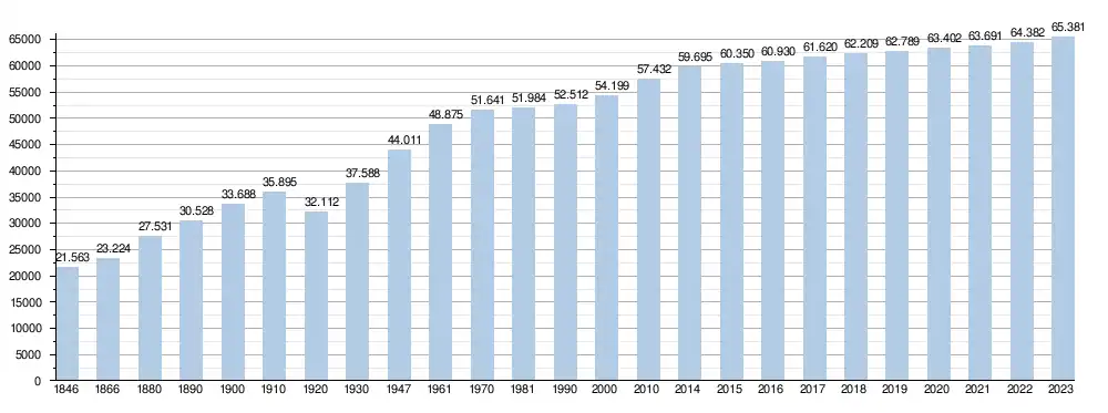 Elle comptait, au , 66 495 habitants (33 287 hommes et 33 208 femmes), soit une densité de 1 112,14 habitants/km²[8] pour une superficie de 59,79 km².