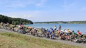 | Le peloton passant devant le lac de la Gimone lors de la troisième étape. | |||