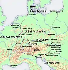 - Germanie. - Plusieurs routes connectaient la Mer du Nord à la Méditerranée. L'une empruntait l'Elbe et rejoignait Carnuntum par les villes d'Olmütz (Eburum) et Brno (Bruna). L'autre longeait la côte de la Mer du Nord par le pays des Bataves (sites de Baarn, Barneveld, Amersfoort et Amerongen) jusqu'à Amberes (l'actuelle Anvers), rattrapait Braine-l’Alleud et Braine-le-Comte, puis suivait la Meuse. Berne était un carrefour de routes venant des vallées du Rhône et du Rhin, et allant vers la plaine de Lombardie.