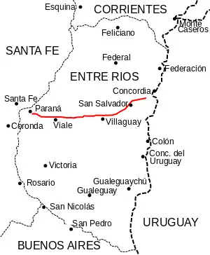 - accès à San Benito (es) (km 0), Colonia Avellaneda (km 14), Viale (es) (km 53) et à Tabossi (6 km par la route provinciale 32) .