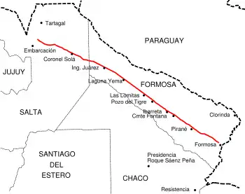 Elle unit ainsi la route nationale 11 aux environs de la ville de Formosa sur la rive droite du río Paraguay avec la route nationale 34 au village d'El Cruce, entre les localités d'Embarcación et de General Ballivián.