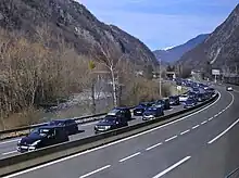 La RN 90 vue depuis la ligne de chemin de fer à Aime. | ||
