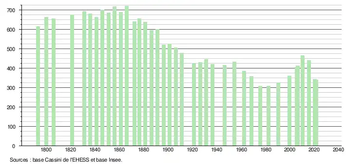 L'évolution du nombre d'habitants est connue à travers les recensements de la population effectués dans la commune depuis 1793. Pour les communes de moins de 10 000 habitants, une enquête de recensement portant sur toute la population est réalisée tous les cinq ans, les populations légales des années intermédiaires étant quant à elles estimées par interpolation ou extrapolation[25]. Pour la commune, le premier recensement exhaustif entrant dans le cadre du nouveau dispositif a été réalisé en 2005[26].
