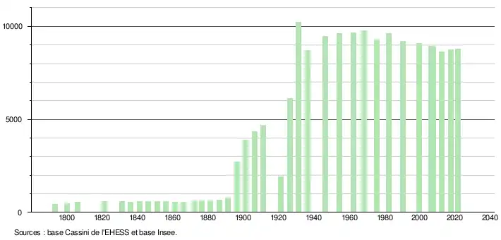 L'évolution du nombre d'habitants est connue à travers les recensements de la population effectués dans la commune depuis 1793. Pour les communes de moins de 10 000 habitants, une enquête de recensement portant sur toute la population est réalisée tous les cinq ans, les populations légales des années intermédiaires étant quant à elles estimées par interpolation ou extrapolation[37]. Pour la commune, le premier recensement exhaustif entrant dans le cadre du nouveau dispositif a été réalisé en 2007[38].