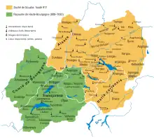 La Haute-Bourgogne reste[pas clair] sous l'influence du roi de Francie orientale Charles le Gros. Ce territoire correspond approximativement à ce qui est aujourd'hui la Suisse romande et comprenait certains territoires voisins, maintenant en Italie (actuelle vallée d'Aoste) et en France (Franche-Comté) .