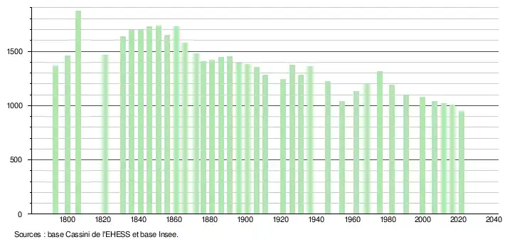L'évolution du nombre d'habitants est connue à travers les recensements de la population effectués dans la commune depuis 1793. Pour les communes de moins de 10 000 habitants, une enquête de recensement portant sur toute la population est réalisée tous les cinq ans, les populations légales des années intermédiaires étant quant à elles estimées par interpolation ou extrapolation[27]. Pour la commune, le premier recensement exhaustif entrant dans le cadre du nouveau dispositif a été réalisé en 2006[28].