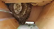 Les abeilles commencent à construire le premier rayon près de la porte d’entrée. En pleine période, un rayon complet peut être fabriqué en deux jours. Il y a toujours deux ou trois rayons à démarrer : les abeilles s’accrochent aux amorces des lattes du plafond (le lattis) tel un rideau et maçonnent le rayon en cours avec de la cire qu’elles décrochent de leur abdomen. Cette construction naturelle permet à la colonie de fabriquer leurs alvéoles sur mesure. La colonie s’installe près de la porte sur les premiers rayons, et au fur et à mesure que la colonie grandit, les rayons avancent vers le centre de la ruche.