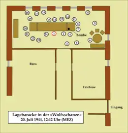 Le , le colonel von Stauffenberg profite d’une réunion d’état-major à la Wolfsschanze[alpha 16], pour faire exploser une bombe vers 12 h 45, à proximité de Hitler[7]. Mais Stauffenberg, qui a déposé la serviette contenant les explosifs, a prétexté d’un appel téléphonique pour s'éclipser : le colonel Heinz Brandt l'aurait alors déplacée de l'autre côté d’un pied de table massif. La serviette a alors explosé à toute proximité de Schmundt et a fait plusieurs autres victimes dont Heinz Brandt lui-même. Néanmoins, le souffle de l’explosion a été atténué par le fait que la réunion s'est tenue dans un bâtiment disposant de fenêtres, ce en raison de la chaleur ambiante, en milieu de journée d’été. Comme Hitler se trouvait en outre partiellement protégé de l'autre côté du pied de table, il n'a été que légèrement blessé[7].