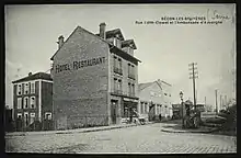 La rue Edith-Cavell, à l'angle de la rue Volta, vers le nord. La poste a été remplacée par un local commercial, dans le même immeuble. Au fond, se trouve le pont des Bruyères. | |||