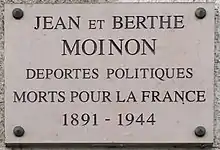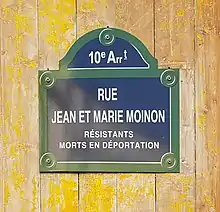 Elle porte le nom de Jean Moinon, un résistant, mort en déportation[1]. Le , le nom de son épouse Marie Moinon, elle aussi résistante, arrêtée le même jour que Jean et également morte en déportation, est ajouté au nom de la rue qui prend ainsi le nom de « rue Jean-et-Marie-Moinon[2] ». Le couple tenait un café-restaurant non loin de là, au no 19, rue du Buisson-Saint-Louis, où ils furent arrêtés par la Gestapo en . Dans cette rue du Buisson-Saint-Louis est apposée une plaque à Jean et Berthe Moinon : Berthe désigne bien Marie Moinon[3].