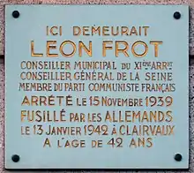 Elle porte ce nom en mémoire de Léon Frot (1900-1942), conseiller municipal communiste du 11e arrondissement de Paris, otage fusillé par les Allemands le [1].