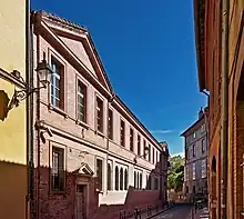 Entre 1833 et 1835, l'architecte Antoine Laforgue construit, à l'emplacement d'anciennes remises, un bâtiment de style néo-classique le long de la rue Saint-Jacques, afin d'accueillir l'école normale primaire. Il se compose d'un corps central, long de neuf travées. Au rez-de-chaussée, les étroites fenêtres en berceau sont groupées par trois dans un cadre en léger ressaut, séparées par des pilastres. Aux extrémités, les trois travées à gauche et la travée unique à droite, sont percées d'une porte et surmontées d'un fronton triangulaire[21],[22].