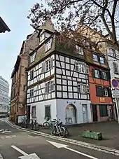 - Formant l'angle avec l'actuelle rue Finkwiller, côté est, une maison est attestée en 1694 lorsque la fondation Saint-Marc la vend à un tonnelier. Sur le plan-relief de 1727, elle ne possède qu'un étage. À la fin du XIXe siècle un deuxième étage et des mansardes sont ajoutés[6].