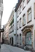 - no 9 : À l'angle avec le no 26 de la rue de l'Ail, la maison a été reconstruite en 1770 pour un marchand. Au-dessus de la porte cochère, transformée en vitrine, un cartouche sculpté montre une construction rustique avec l'inscription « À la Grange » et la date 1647[12]. Au XIVe siècle elle s'appelait déjà Zu der Schüren. Sur les mascarons, des masques figurent les quatre saisons[6]. Elle pourrait avoir appartenu à l'imprimeur Matthias Hupfuff[12],[13], puis, un siècle plus tard, à l'ammeister Ulrich Mürssel et, en 1645, au général Philippe-Henri Kulmann [12].