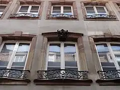 Une étude de la fin du XIXe siècle sur le prosélytisme de Samuel Heinrich Fröhlich (de) à Strasbourg dans les années 1840 montre qu'il réunissait ses adeptes, les Fröhlichianer, dans cette maison de la Stallgasse, devenue lieu de rencontre de la communauté[7]. - no 4 : L'édifice a été reconstruit en 1769 pour un marchand de vins[8]. La façade, à quatre niveaux et quatre travées de baies[9], comporte un rez-de-chaussée en pierres de taille percé de baies en plein cintre qui reposent sur des pilastres creusés en panneaux[3]. Les quatre arcades du rez-de-chaussée sont ornées, sur les clés de cintre, de mascarons représentant les quatre saisons, exceptionnellement sculptées en buste. Le Printemps, l'Été et l'Automne incarnés par de jeunes bourgeoises à grands chapeaux, l'Hiver par un vieillard portant une capuche ornée de feuilles de chêne[9].