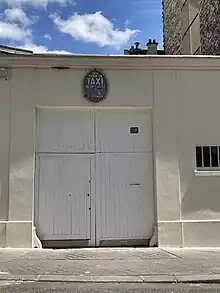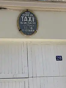 - No 28 : au-dessus de la porte d’un garage, ancienne enseigne pour taxi et fiacre.
