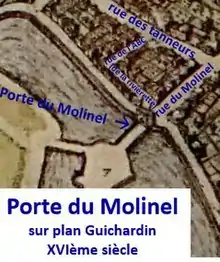 La partie perpendiculaire à la rue du Molinel, parallèle à la rue d’Amiens et à la rue des Tanneurs longeait jusqu’en 1603 le rempart de la ville, la porte du Molinel étant située à l’angle de la rue du Molinel.