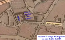 Le couvent des Augustins s’y installe en 1614 et fonde en 1622 un collège enseignant le latin, le grec et la rhétorique après autorisation du Magistrat nonobstant l’opposition du collège Saint-Pierre. Le couvent construit son église en 1638 à l’angle de la rue du Vieux Marché aux Moutons à l’emplacement de l’ancien siège de la banque Scalbert-Dupont (bâtiment en travaux en 2022 pour être transformé en hôtel). Les religieux font couvrir en 1686 le canal du Haut-Becquerel qui traversait leur propriété] [2]. La prospérité du couvent XVIIe siècle lui permet de s’étendre en acquérant des maisons aux alentours dans l’ilot. Le collège décline à la fin du XVIIIe siècle et ferme en 1787. Les religieux qui étaient encore 23 sont chassés en 1791. Les bâtiments du couvent disparaissent au début du XIXe siècle et sont remplacés par des maisons, puis à partir du milieu du XIXe siècle par une usine de tissage s’étendant jusqu’à la rue du Bourdeau (emplacement de la rue Charles Saint-Venant) et par l’hôtel particulier de son propriétaire, la famille Boutry-Van Isselteyn[3]. L’institution Sainte-Claire (actuel collège et lycée privé) est construit en 1887 côté pair de la rue.