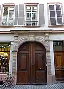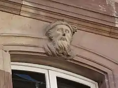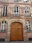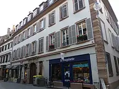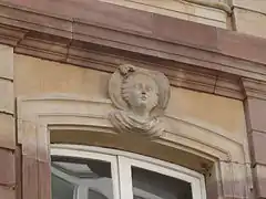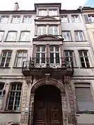 - C'était la maison de l'architecte du Palais Rohan, Joseph Massol, construite par et pour lui-même, un balcon en fer forgé y ayant été rajouté en 1751[4]. Parementée sur trois niveaux, la façade comporte des chaînes à refends, trois travées de baies et un avant-corps central. Elle n'est ornée que d'un seul mascaron, une allégorie de Minerve s'inspirant de celle du Palais Rohan. Sur l'égide, la déesse porte le compas et le traçoir des architectes[17].