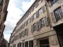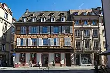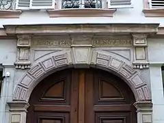 - Connue sous le nom d'« hôtel de Saxe, » la maison appartenait au XVIIe siècle au stettmestre Henri Balthasar de Kippenheim, puis à différentes familles nobles. Elle est vendue en 1779 à Christine de Saxe, abbesse de Remiremont, dont on a longtemps pensé qu'elle en était la commanditaire. Depuis la fin de la Première Guerre mondiale, la demeure appartient à une fondation diocésaine[12]. Surmontée d'un fronton triangulaire percé d'un oculus, la façade de style Régence, entièrement parementée de grès, comporte trois niveaux et neuf travées de baies. Elle est ornée de mascarons figurant les quatre saisons[5],[13]. Cette façade fait l'objet d'un classement au titre des monuments historiques depuis 1927[14].