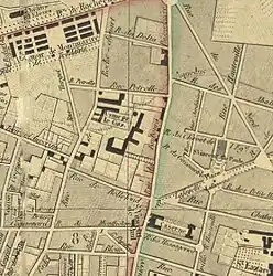 - No 92 : Étienne Calla, mécanicien et élève de Jacques de Vaucanson, installe une fonderie en 1820[23]. C'est la maison Calla qui réalise les fontes ornementales de l'église Saint-Vincent-de-Paul à la demande de Jacques Hittorff[24]. En 1849, la fonderie Calla déménage au nord de l'enclos Saint-Lazare, à La Chapelle.