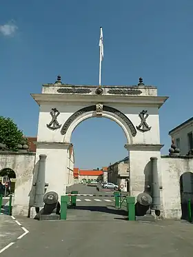 D'azur à la fasce haussée d'argent chargée d'une croisette ancrée de sable, accompagnée en chef d'un écouvillon à canon d'or posé en fasce et en pointe d'un canon contourné d'or, senestré de trois boulets du même, mal ordonnés et accolés.