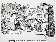 La maison, qui se trouvait sur l'emplacement d'un garage (que l'on aperçoit sur la photo de droite ci-dessous) et d'une partie de la ruelle, a été démolie en 1906. Selon Adolphe Seyboth[3], le millésime 1532 était gravé sur un linteau de fenêtre de la construction d'origine. Celle-ci servait de magasin de chanvre au début du XVIIe siècle. En 1675, elle est revendue au boucher Georges Mehl qui possède déjà la maison voisine, précisément dans la rue des Bouchers[5].