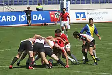 Le rugby à sept (ou rugby à 7)[N 1],[1] est la variante du rugby à XV qui se joue par équipes de sept joueurs sur le terrain (plus les remplaçants). Le rugby à sept reprend les caractères communs du rugby à XV : deux équipes qui se disputent un ballon ovale, le ballon joué à la main (passes) ou au pied (coups), des formes de mêlées et de touches, un objectif qui consiste à marquer plus de points que l'adversaire en réussissant soit des essais soit des buts.