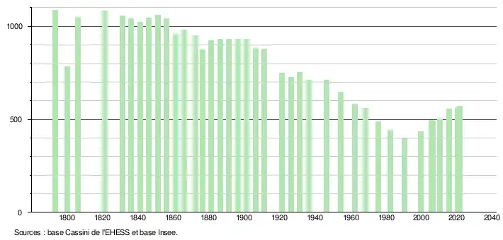 L'évolution du nombre d'habitants est connue à travers les recensements de la population effectués dans la commune depuis 1793. Pour les communes de moins de 10 000 habitants, une enquête de recensement portant sur toute la population est réalisée tous les cinq ans, les populations légales des années intermédiaires étant quant à elles estimées par interpolation ou extrapolation[22]. Pour la commune, le premier recensement exhaustif entrant dans le cadre du nouveau dispositif a été réalisé en 2005[23].
