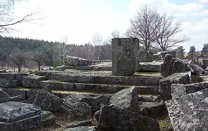 Parmi les blocs de pierre qui ont échappé au pillage on remarque des fragments de corniches, de plinthes et d'éléments moulurés.