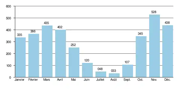 Le débit journalier maximal enregistré à Dourbies durant cette période, a été de 11,0 m3/s . En comparant cette valeur à l'échelle des QJX de la rivière, l'on constate que cette crue était d'ordre cinquantennal et donc assez exceptionnelle.