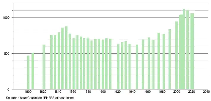 L'évolution du nombre d'habitants est connue à travers les recensements de la population effectués dans la commune depuis 1800. Pour les communes de moins de 10 000 habitants, une enquête de recensement portant sur toute la population est réalisée tous les cinq ans, les populations légales des années intermédiaires étant quant à elles estimées par interpolation ou extrapolation[16]. Pour la commune, le premier recensement exhaustif entrant dans le cadre du nouveau dispositif a été réalisé en 2004[17].