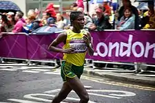 Claudette Mukasakindi lors de l'épreuve de marathon féminin aux Jeux olympiques de Londres. | ||