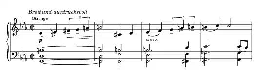 Un exemple est le thème principal du premier mouvement de sa Symphonie no 4 en mi bémol majeur, à la mesure 43[4].