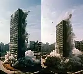 Les techniciens du CDI ont installé 777 charges d'explosifs, totalisant près de 1 000 livres. Aux premières heures du 16 novembre de 1975, les environs de la praça da Sé ont été pris par des milliers de spectateurs pour assister à cet exploit sans précédent dans la ville. A 7h32 du matin, les cloches de la cathédrale de la Sé ont sonné intensément, marquant le moment de l'implosion. En 9 secondes, le bâtiment de 32 étages avait été réduit en une masse de décombres, dans une implosion parfaite (les seuls dégâts étaient deux vitres brisées d'un immeuble et d'une maison aux abords de l'implosion), pour un coût de 270 000 $. Il s'agit de la première implosion réalisée en Amérique latine. Les travaux de nettoyage ont duré 20 jours et les travaux ont enfin pu reprendre avec la rapidité nécessaire[8],[9].